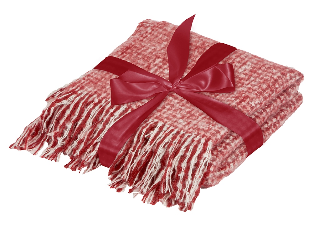 Super soft and warm blanket will keep you warm on a cold day and decorate your interior. The blanket is adorned with fringe on the sides. The set includes a burgundy ribbon where you can place your logo.