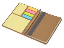 The compact set includes colorful stickers of different sizes, a notebook with lined paper, and a pen with a body made of recycled cardboard. The cover is made of textured artificial leather, which changes color to a deeper shade when embossed.