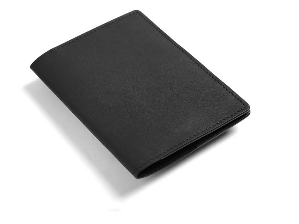 Classic cover made of doubled leather, painted edges, neat stitching, slots for four cards, space for passport and vehicle documents.
