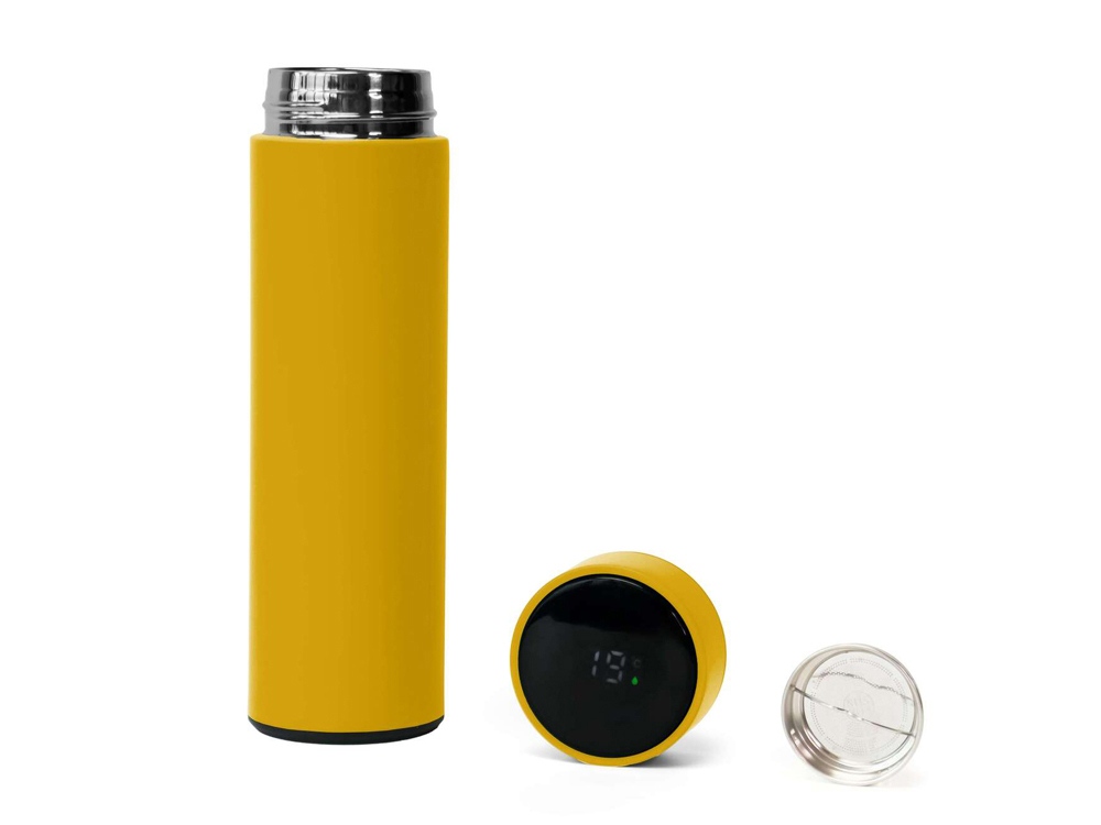 Thermos made of stainless steel, covered with colorful soft touch, with a lid that has a built-in thermometer and LED display showing the temperature inside the thermos. Volume: 500 ml. Packaging: each thermos in a kraft box.