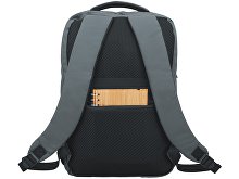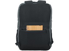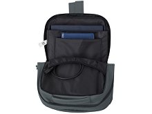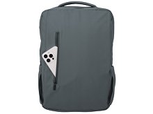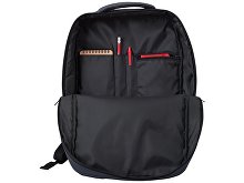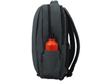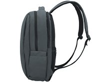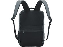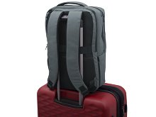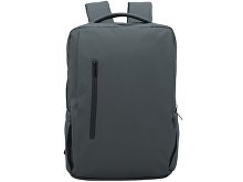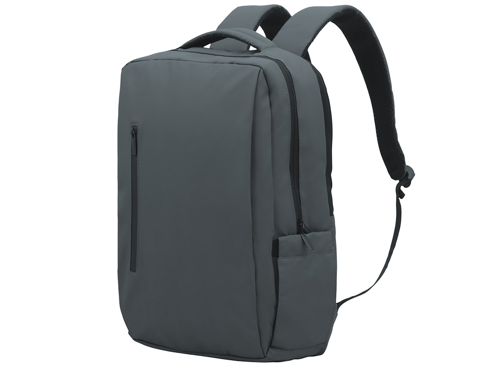 Waterproof business backpack with two spacious compartments and a front zippered pocket. One compartment has pockets for a laptop and tablet, while the other has an organizer and plenty of space for clothes and other items for a business trip. There is a hidden zippered pocket on the mesh back for documents and personal items, as well as a strap for attaching to a suitcase handle. There is a comfortable soft handle on top for carrying. The straps are adjustable in length.
