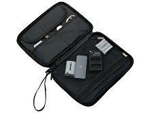 It has two independent zippered compartments, each equipped with numerous pockets and compartments of different shapes. This allows you to conveniently store cables, chargers, headphones, flash drives, and other small gadgets, preventing them from tangling and getting damaged.